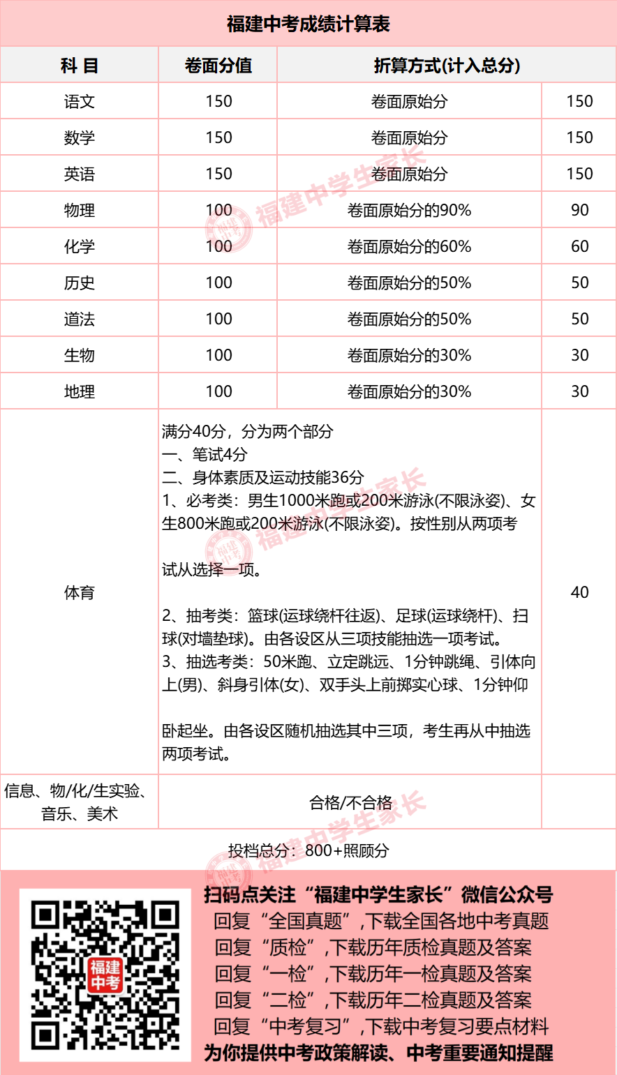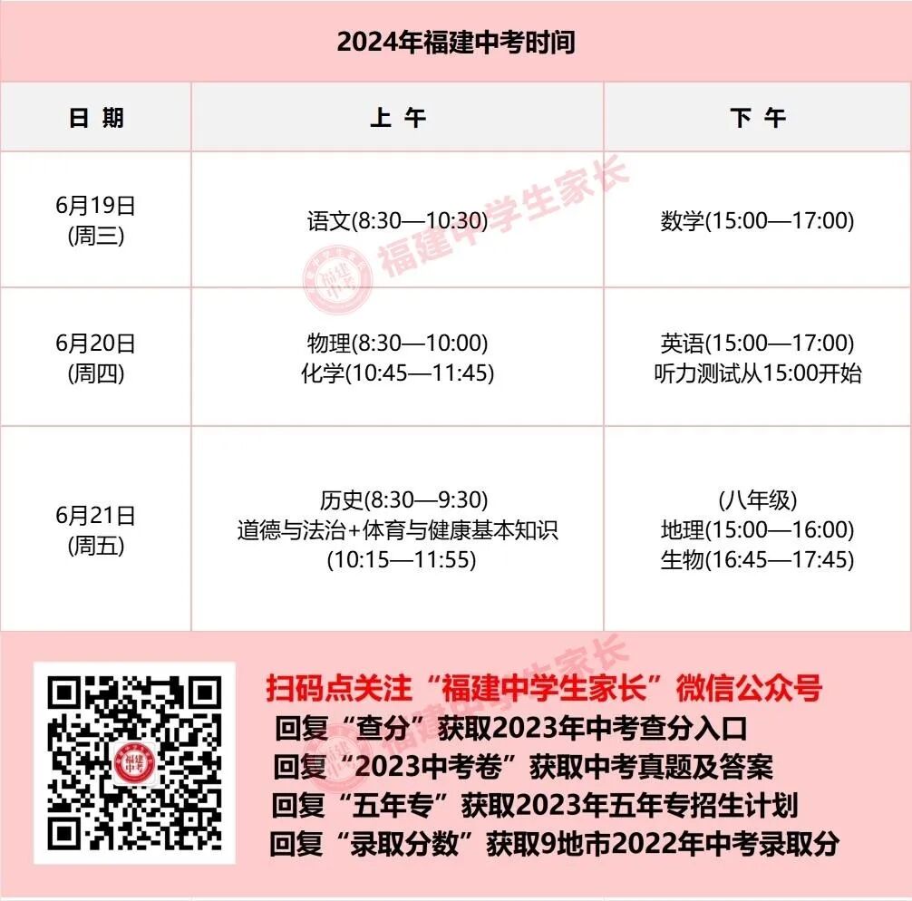 回复“中考时间”查看24年福建中考时间及分值计算