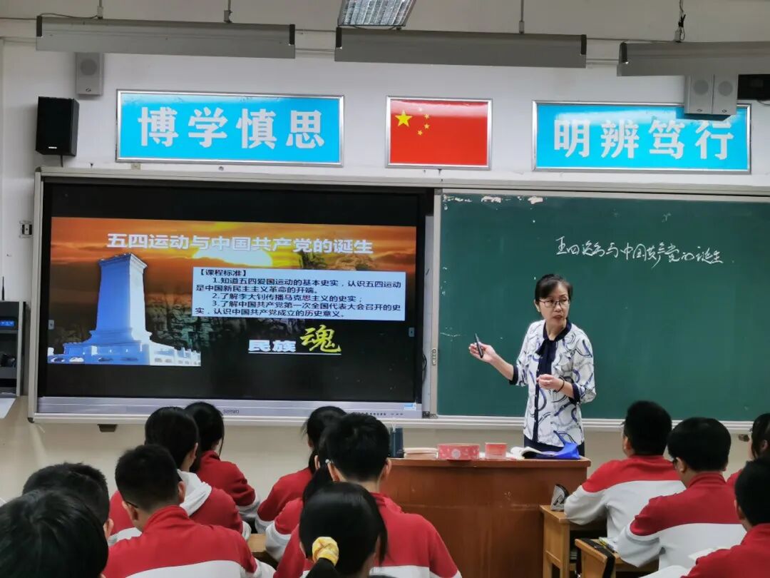 历史组陈东老师展示了题为《五四运动和中国共产党的诞生》的复习专题课,通过图片展示、史料分析,习题讲练等方式逐步落实课堂教学目标。